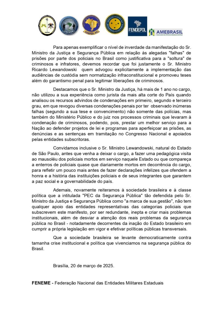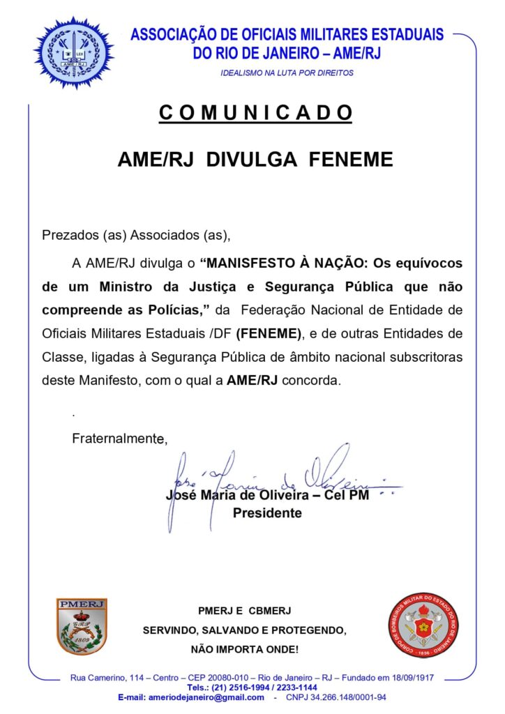 A AME/RJ divulga o “MANISFESTO À NAÇÃO: Os equívocos de um Ministro da Justiça e Segurança Pública que não compreende as Polícias,” da Federação Nacional de Entidades de Oficiais Militares Estaduais /DF (FENEME), e de outras Entidades de Classe, ligadas à Segurança Pública de âmbito nacional subscritoras