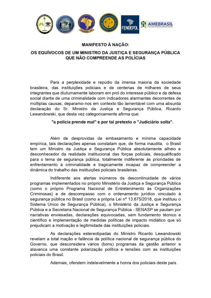 MANISFESTO À NAÇÃO: Os equívocos de um Ministro da Justiça e Segurança Pública que não compreende as Polícias