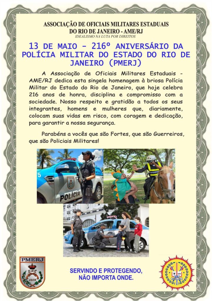 Neste dia 13 de maio, a Polícia Militar do Estado do Rio de Janeiro celebra 216 anos de história e contribuição à Sociedade Fluminense. A AME/RJ parabeniza a Corporação e ao mesmo tempo, enaltece cada um de seus integrantes, Homens e Mulheres que se dedicam de corpo e alma à genuína missão de Servir e Proteger.